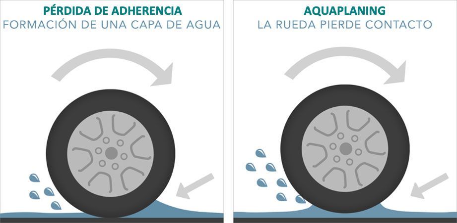 El primero de los problemas es la reducción de la adherencia entre la rueda y el pavimento, esto va a redundar en perdida de tracción, capacidad de frenado y empeoramiento del giro del vehículo. Sí la perdida de adherencia es lo suficientemente grande, el vehículo puede sufrir un fenómeno conocido como aquaplaning. Dicho fenómeno se produce cuando las ruedas no son capaces de evacuar toda el agua presente sobre el asfalto, ocasionado una pérdida total de contacto entre las ruedas y la carretera provocando qué el coche se deslice flotando sobre el pavimento.