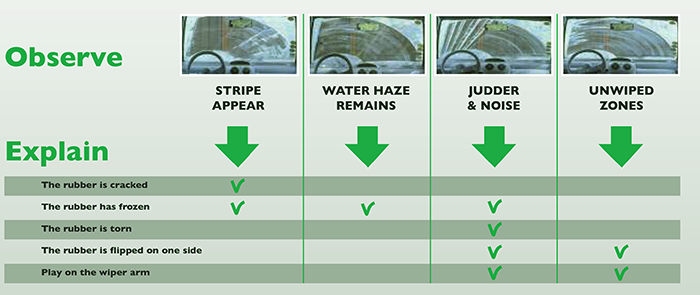 En cualquier caso, es una señal de que es hora de cambiar las escobillas. Al hacerlo, piense en la posibilidad de instalar un juego de escobillas con una combinación de caucho natural y goma sintética en lugar de escobillas de caucho 100 % natural. Las gomas sintéticas han demostrado ser más resistentes a los daños solares y “se ajustan” mejor al parabrisas que el caucho natural.