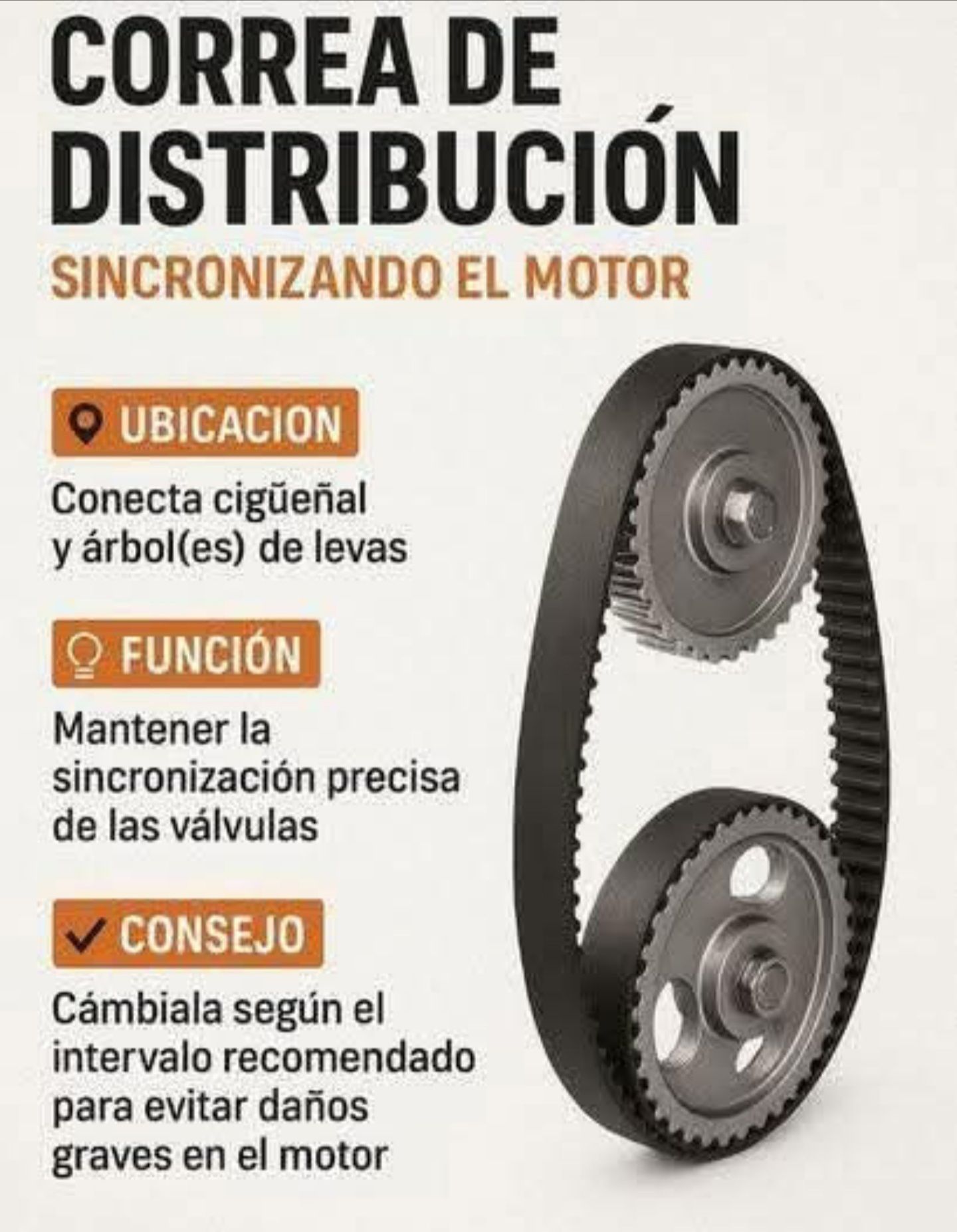 Sincronizando el Motor 📍 Elemento esencial que asegura la sincronización perfecta entre el cigüeñal y los árboles de levas para un funcionamiento armónico del motor. 📌 Ubicación: 🔧 Conecta directamente el cigüeñal con uno o más árboles de levas, generalmente en la parte frontal del motor, protegida por una cubierta plástica o metálica. ⚙️ Función principal: 🧠 Sincroniza con precisión la apertura y cierre de las válvulas de admisión y escape, asegurando que ocurran en el momento exacto durante los ciclos del pistón. ⚠️ Riesgos por desgaste o rotura: 🔩 Daño catastrófico del motor : Si se rompe mientras el motor está en marcha, las válvulas pueden chocar con los pistones. ⏱️ Pérdida de sincronización: Puede causar fallos en la combustión, pérdida de potencia o incluso apagones repentinos. ✅ Consejo técnico: Cámbiala según el kilometraje recomendado por el fabricante (usualmente entre 60,000 y 100,000 km). No esperar a que falle, ya que no da señales evidentes antes de romperse.