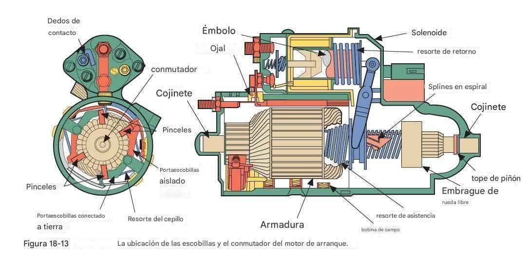 Funcionamiento y partes 🔋 1. Función principal El motor de arranque convierte la energía eléctrica de la batería en energía mecánica de rotación, la cual gira el cigüeñal del motor para iniciar el ciclo de combustión. 🔩 2. Componentes principales (según la imagen) 🔹 Solenoide Es un interruptor electromagnético que activa el motor de arranque cuando giras la llave de encendido. Contiene un émbolo y un resorte de retorno. Su función: Conecta la corriente eléctrica del acumulador hacia el motor de arranque. Empuja el piñón hacia el volante del motor para engranar los dientes. 🔹 Émbolo y resorte de retorno El émbolo se mueve al ser magnetizado por el solenoide. El resorte de retorno lo devuelve a su posición original cuando se apaga el motor. Este movimiento mueve el piñón hacia adelante para acoplarse con la corona del volante. 🔹 Armadura Es el rotor del motor eléctrico. Gira al recibir corriente de las bobinas de campo. Transmite el movimiento al piñón de ataque mediante los splines en espiral (ranuras helicoidales). 🔹 Bobina de campo Genera un campo magnético que hace girar la armadura. Puede ser de imanes permanentes o electromagnética (según el diseño). 🔹 Conmutador y escobillas El conmutador dirige la corriente eléctrica a las bobinas del rotor. Las escobillas (hechas de carbón o grafito) hacen contacto con el conmutador mientras gira. Dos escobillas están conectadas a tierra y dos aisladas para formar el circuito. 🔹 Cojinetes Soportan el eje del rotor permitiendo un giro libre y alineado. Reducen la fricción y el desgaste mecánico. 🔹 Embrague de rueda libre (Bendix) Permite que el piñón engrane con el volante solo al arrancar. Una vez encendido el motor, desacopla automáticamente para evitar que el motor principal gire el motor de arranque. Este sistema protege el motor eléctrico de daños. 🔹 Splines en espiral Son ranuras helicoidales que permiten el movimiento del piñón hacia adelante y atrás durante el acoplamiento y desacoplamiento. 🔹 Tope de piñón Limita el desplazamiento del piñón, evitando que se pase del engranaje del volante. 🔁 3. Funcionamiento paso a paso 🔑 Se gira la llave de encendido: La batería envía corriente al solenoide del motor de arranque. ⚡ Activación del solenoide: El solenoide empuja el émbolo, que mueve el piñón hacia el volante del motor. Al mismo tiempo, cierra el circuito principal que alimenta la armadura. ⚙️ Giro del motor de arranque: La armadura gira, moviendo el piñón. El piñón engrana con la corona del volante y hace girar el cigüeñal. 🔥 Arranque del motor: Una vez que el motor de combustión enciende, el piñón se desacopla automáticamente gracias al embrague de rueda libre. 🔁 Retorno: Al soltar la llave, el circuito se abre. El resorte de retorno devuelve el émbolo y el piñón a su posición inicial. 🧠 4. Fallos comunes del motor de arranque Fallo: Causa probable No gira el motor: Solenoide o escobillas dañadas Sonido de clic sin arranque: Fallo en el émbolo o batería débil Ruido metálico: Piñón no engrana correctamente Giro lento: Mal contacto o desgaste interno
