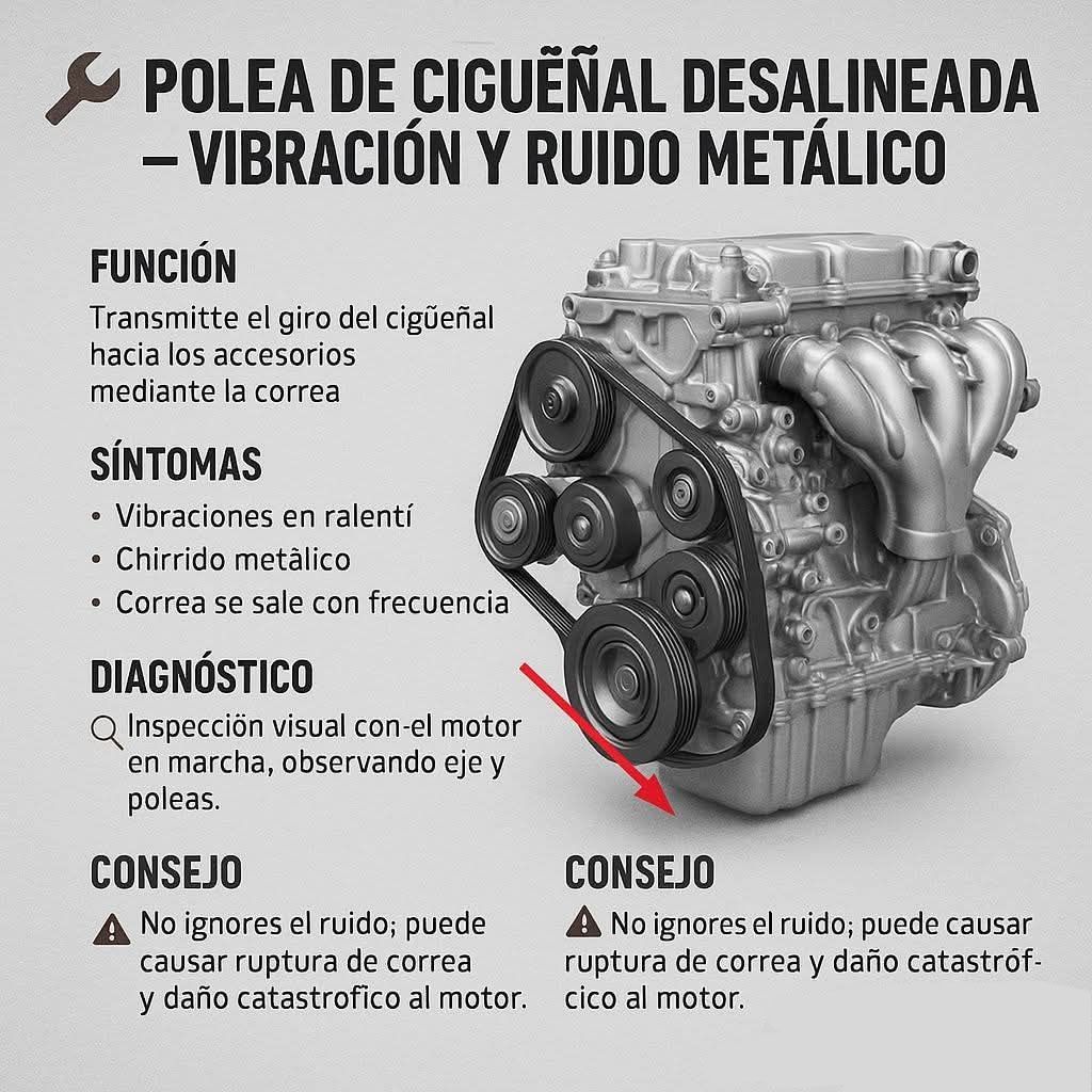 Polea de Cigüeñal Desalineada: Vibración y Ruido Metálico ⚙️ Introducción ¿Tu motor vibra al ralentí o escuchas un chirrido metálico constante? 😖 Podrías estar frente a una polea de cigüeñal desalineada, un problema que comienza con ruidos leves… pero que puede terminar en una ruptura total de la correa y daños graves al motor. --- 🔩 Función de la Polea del Cigüeñal La polea del cigüeñal transmite el giro del motor hacia los accesorios: alternador, bomba de dirección, compresor de A/C y tensor. Su correcta alineación es esencial para mantener la tensión uniforme de la correa y evitar vibraciones. --- 🚨 Síntomas Comunes 🔸 Vibraciones en ralentí o sacudidas leves del motor. 🔸 Ruido metálico o “chirrido seco” al acelerar. 🔸 Correa que se sale, se desgasta rápido o se deshilacha en los bordes. Estas señales indican que la polea o su dámper (amortiguador de vibración) podrían estar deformados o fuera de eje. --- 🧰 Diagnóstico 1️⃣ Encender el motor y observar el giro de la correa y poleas. Si la polea “baila” o se mueve lateralmente, hay desalineación. 2️⃣ Usa una regla o láser de alineación sobre las poleas para detectar desviaciones. 3️⃣ Revisa el eje del cigüeñal y el soporte del dámper: pueden estar doblados o con el buje gastado. --- ⚠️ Consejo Técnico 🚫 No ignores el ruido. Una polea desalineada puede causar la ruptura de la correa de accesorios, y si se enreda con la de distribución, el daño puede ser catastrófico. 🧠 Siempre reemplazar la polea con calidad y verifica el apriete del perno del cigüeñal con el torque especificado.
