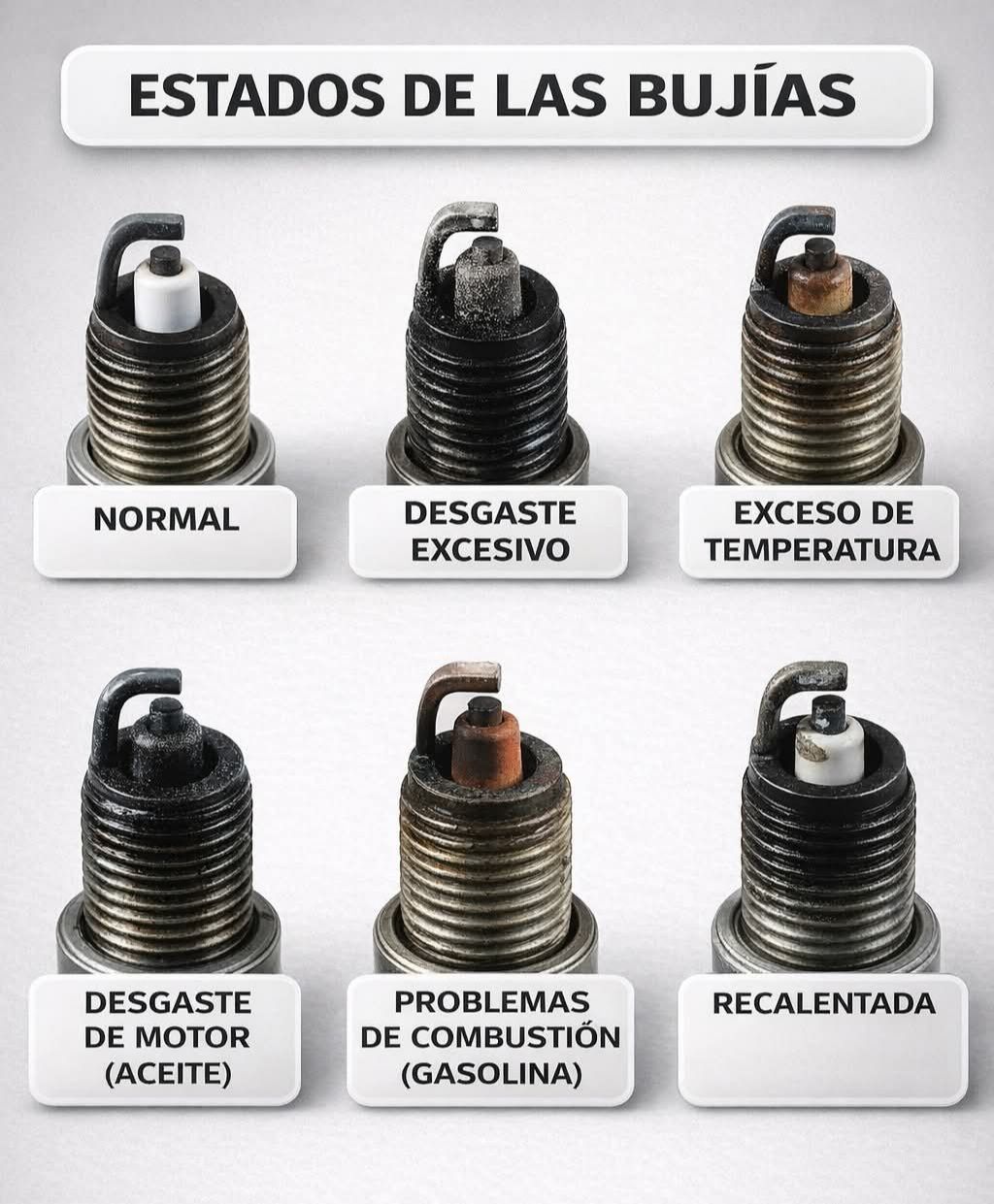 La imagen presenta distintos tipos de bujías organizadas para facilitar un diagnóstico visual claro del motor ⚙️👇 🔹 Normal Se observa un aislador de color claro y electrodos limpios. Este aspecto indica una combustión correcta, mezcla adecuada y buen funcionamiento general del motor 🚗✅ 🔹 Desgaste excesivo El electrodo aparece erosionado y oscuro. Esto señala uso prolongado, pérdida de eficiencia en la chispa y necesidad de reemplazo para evitar fallos de encendido ⚠️ 🔹 Exceso de temperatura La bujía muestra una coloración blanquecina y signos de sobrecalentamiento. Suele relacionarse con mezcla pobre, fallos en el sistema de enfriamiento o un grado térmico incorrecto 🔥 🔹 Desgaste de motor (aceite) Se aprecian residuos negros y húmedos en la bujía. Este estado indica consumo de aceite, desgaste de anillos o sellos de válvulas, y posible pérdida de compresión 🛢️ 🔹 Problemas de combustión (gasolina) La bujía presenta depósitos marrón oscuro o carbonilla. Esto es típico de mezcla rica, inyección defectuosa o fallos en el sistema de encendido ⛽ 🔹 Recalentada Los electrodos se ven deformados y la cerámica dañada. Es una condición crítica que puede causar fallos severos del motor si no se corrige de inmediato